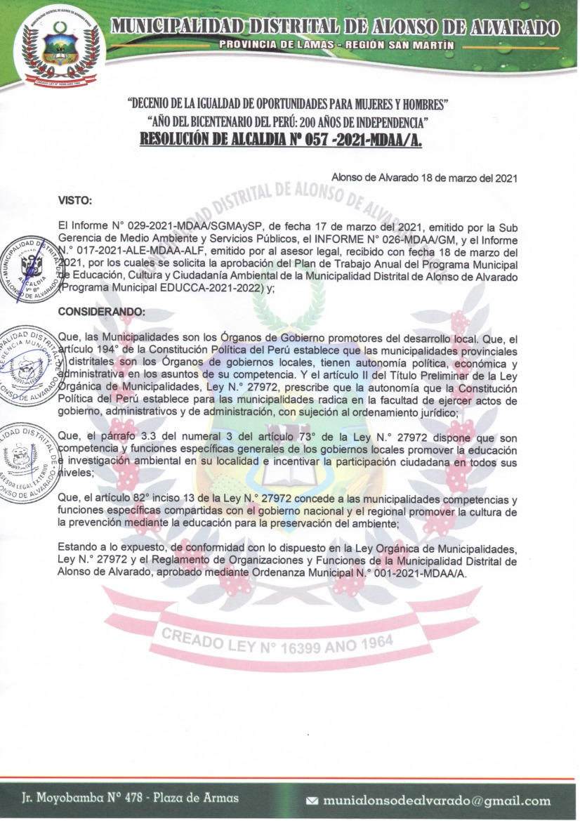 La presente Resolución aprueba el Plan de Trabajo 2021 del Programa Municipal de Educación, Cultura y Ciudadanía Ambiental de la Municipalidad Distrital de Alonso de Alvarado, con la finalidad de definir las actividades de educación, cultura y ciudadanía ambiental que se desarrollarán en la localidad durante el presente año.