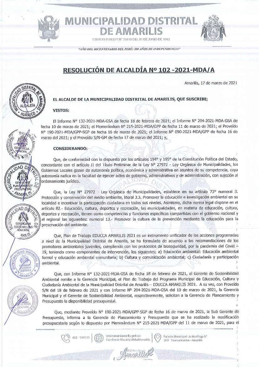 La presente Resolución aprueba el Plan de Trabajo 2021 del Programa Municipal de Educación, Cultura y Ciudadanía Ambiental de la Municipalidad Distrital de Amarilis, con la finalidad de definir las actividades de educación, cultura y ciudadanía ambiental que se desarrollarán en la localidad durante el presente año.
