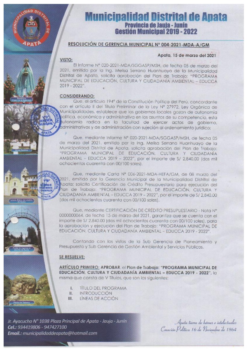 La presente Resolución aprueba el Plan de Trabajo 2021 del Programa Municipal de Educación, Cultura y Ciudadanía Ambiental de la Municipalidad Distrital de Apata, con la finalidad de definir las actividades de educación, cultura y ciudadanía ambiental que se desarrollarán en la localidad durante el presente año.