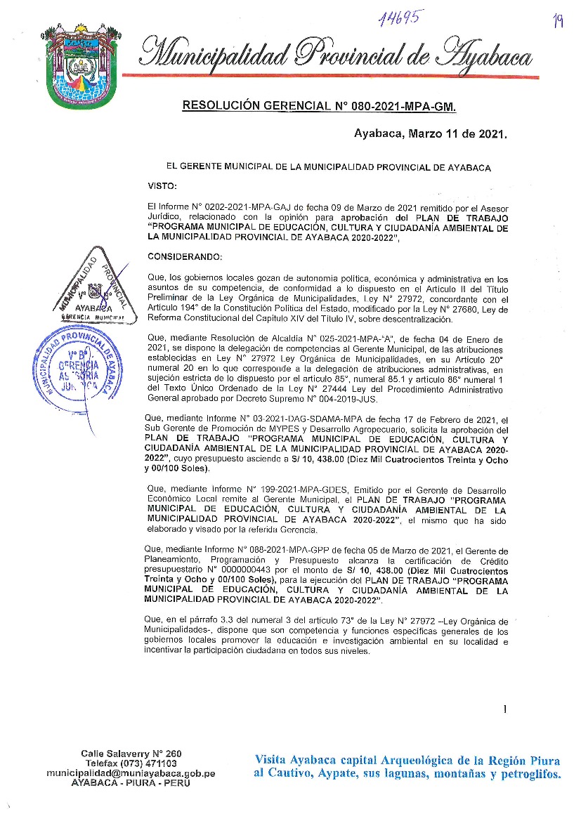 La presente Resolución aprueba el Plan de Trabajo 2021 del Programa Municipal de Educación, Cultura y Ciudadanía Ambiental de la Municipalidad Provincia de Ayabaca, con la finalidad de definir las actividades de educación, cultura y ciudadanía ambiental que se desarrollarán en la localidad durante el presente año.