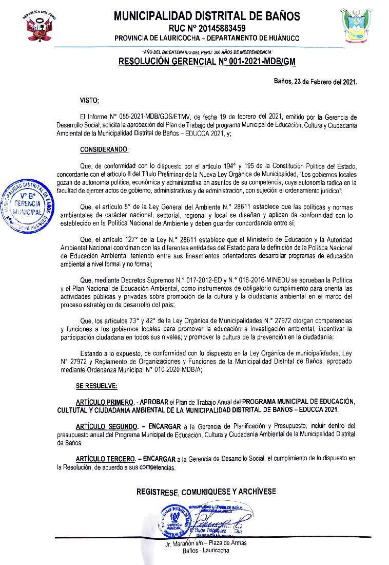 La presente Resolución aprueba el Plan de Trabajo 2021 del Programa Municipal de Educación, Cultura y Ciudadanía Ambiental de la Municipalidad Distrital de Baños, con la finalidad de definir las actividades de educación, cultura y ciudadanía ambiental que se desarrollarán en la localidad durante el presente año.