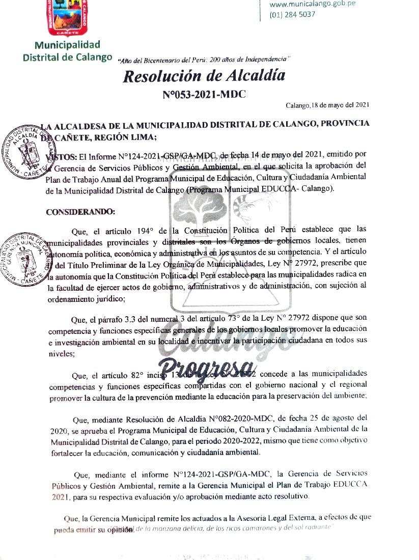 La presente Resolución aprueba el Plan de Trabajo 2021 del Programa Municipal de Educación, Cultura y Ciudadanía Ambiental de la Municipalidad Distrital de Calango, con la finalidad de definir las actividades de educación, cultura y ciudadanía ambiental que se desarrollarán en la localidad durante el presente año.