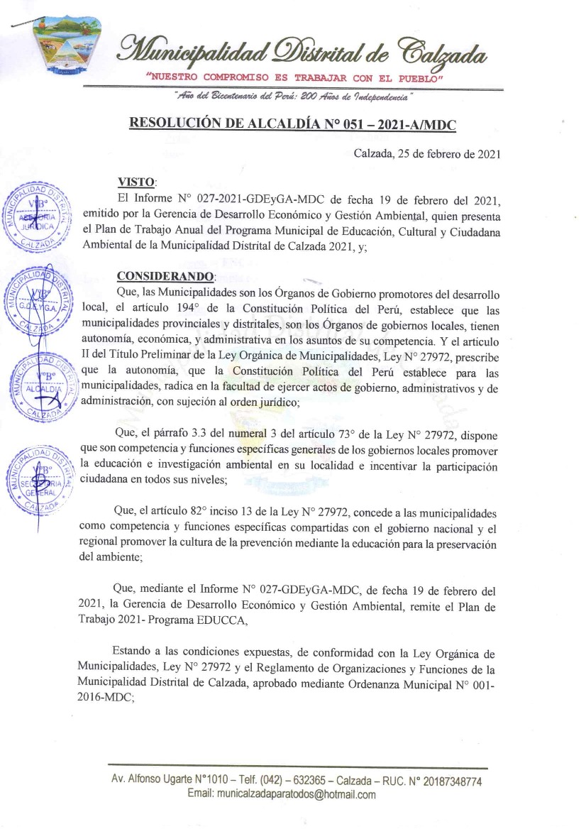 La presente Resolución aprueba el Plan de Trabajo 2021 del Programa Municipal de Educación, Cultura y Ciudadanía Ambiental de la Municipalidad Distrital de Calzada, con la finalidad de definir las actividades de educación, cultura y ciudadanía ambiental que se desarrollarán en la localidad durante el presente año.