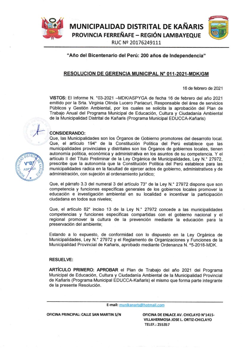 La presente Resolución aprueba el Plan de Trabajo 2021 del Programa Municipal de Educación, Cultura y Ciudadanía Ambiental de la Municipalidad Distrital de Cañaris, con la finalidad de definir las actividades de educación, cultura y ciudadanía ambiental que se desarrollarán en la localidad durante el presente año.