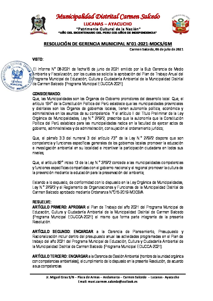 La presente Resolución aprueba el Plan de Trabajo 2021 del Programa Municipal de Educación, Cultura y Ciudadanía Ambiental de la Municipalidad Distrital de Carmen Salcedo, con la finalidad de definir las actividades de educación, cultura y ciudadanía ambiental que se desarrollarán en la localidad durante el presente año.