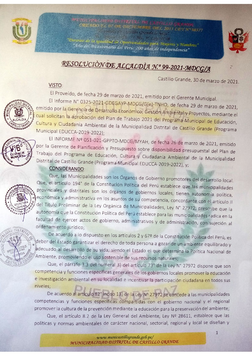 La presente Resolución aprueba el Plan de Trabajo 2021 del Programa Municipal de Educación, Cultura y Ciudadanía Ambiental de la Municipalidad Distrital de Castillo Grande, con la finalidad de definir las actividades de educación, cultura y ciudadanía ambiental que se desarrollarán en la localidad durante el presente año.
