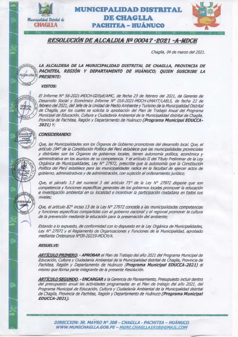 La presente Resolución aprueba el Plan de Trabajo 2021 del Programa Municipal de Educación, Cultura y Ciudadanía Ambiental de la Municipalidad Distrital de Chaglla, con la finalidad de definir las actividades de educación, cultura y ciudadanía ambiental que se desarrollarán en la localidad durante el presente año.