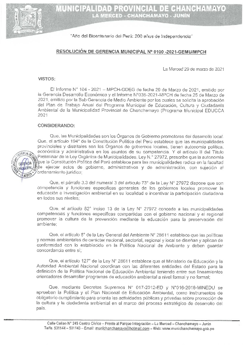 La presente Resolución aprueba el Plan de Trabajo 2021 del Programa Municipal de Educación, Cultura y Ciudadanía Ambiental de la Municipalidad Provincial de Chanchamayo, con la finalidad de definir las actividades de educación, cultura y ciudadanía ambiental que se desarrollarán en la localidad durante el presente año.