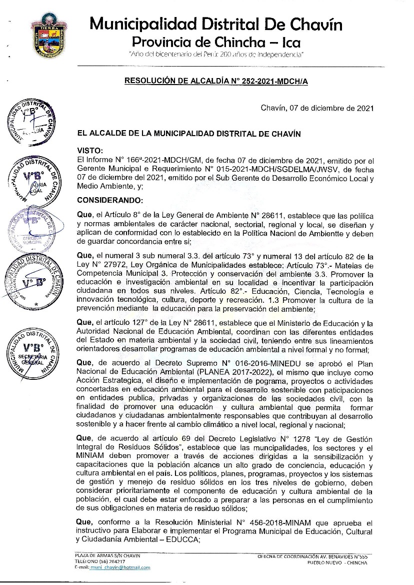 La presente Resolución aprueba el Plan de Trabajo 2021 del Programa Municipal de Educación, Cultura y Ciudadanía Ambiental de la Municipalidad Distrital de Chavín, distrito de Chincha, con la finalidad de definir las actividades de educación, cultura y ciudadanía ambiental que se desarrollarán en la localidad durante el presente año.