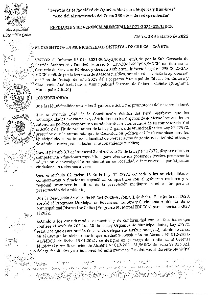 La presente Resolución aprueba el Plan de Trabajo 2021 del Programa Municipal de Educación, Cultura y Ciudadanía Ambiental de la Municipalidad Distrital de Chilca, con la finalidad de definir las actividades de educación, cultura y ciudadanía ambiental que se desarrollarán en la localidad durante el presente año.