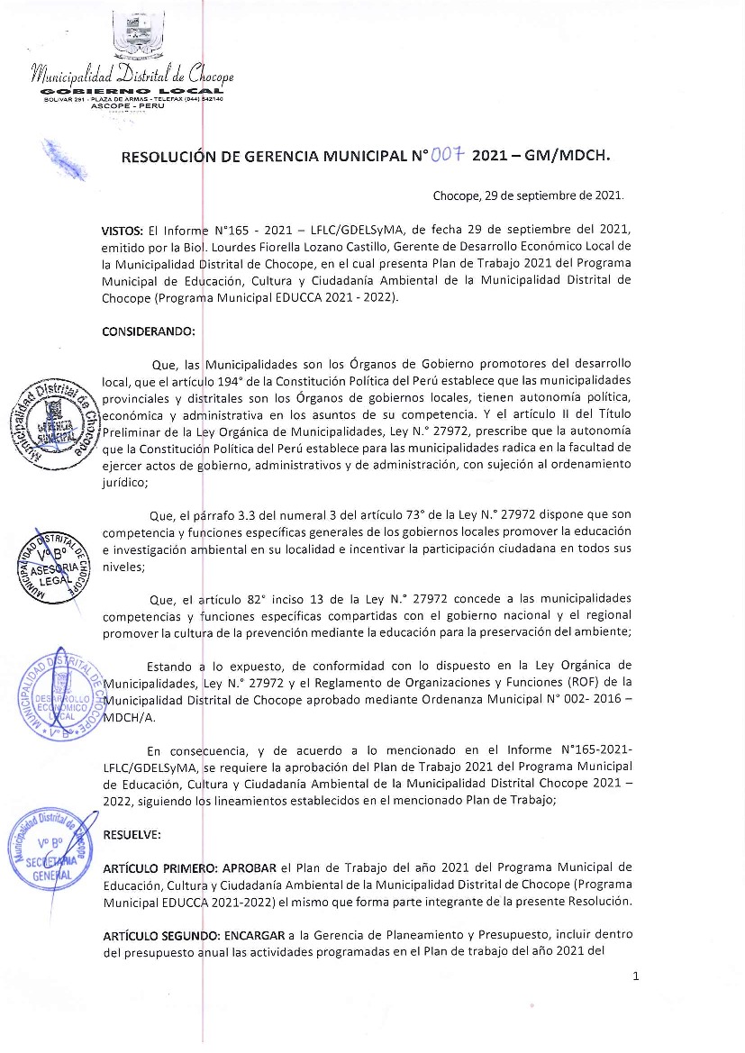 La presente Resolución aprueba el Plan de Trabajo 2021 del Programa Municipal de Educación, Cultura y Ciudadanía Ambiental de la Municipalidad Distrital de Chocope, con la finalidad de definir las actividades de educación, cultura y ciudadanía ambiental que se desarrollarán en la localidad durante el presente año.