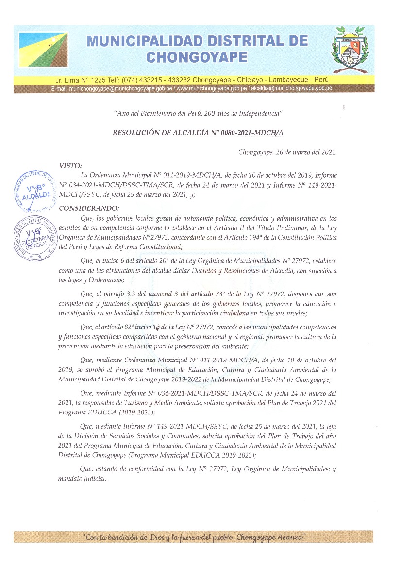La presente Resolución aprueba el Plan de Trabajo 2021 del Programa Municipal de Educación, Cultura y Ciudadanía Ambiental de la Municipalidad Distrital de Chongoyape, con la finalidad de definir las actividades de educación, cultura y ciudadanía ambiental que se desarrollarán en la localidad durante el presente año.