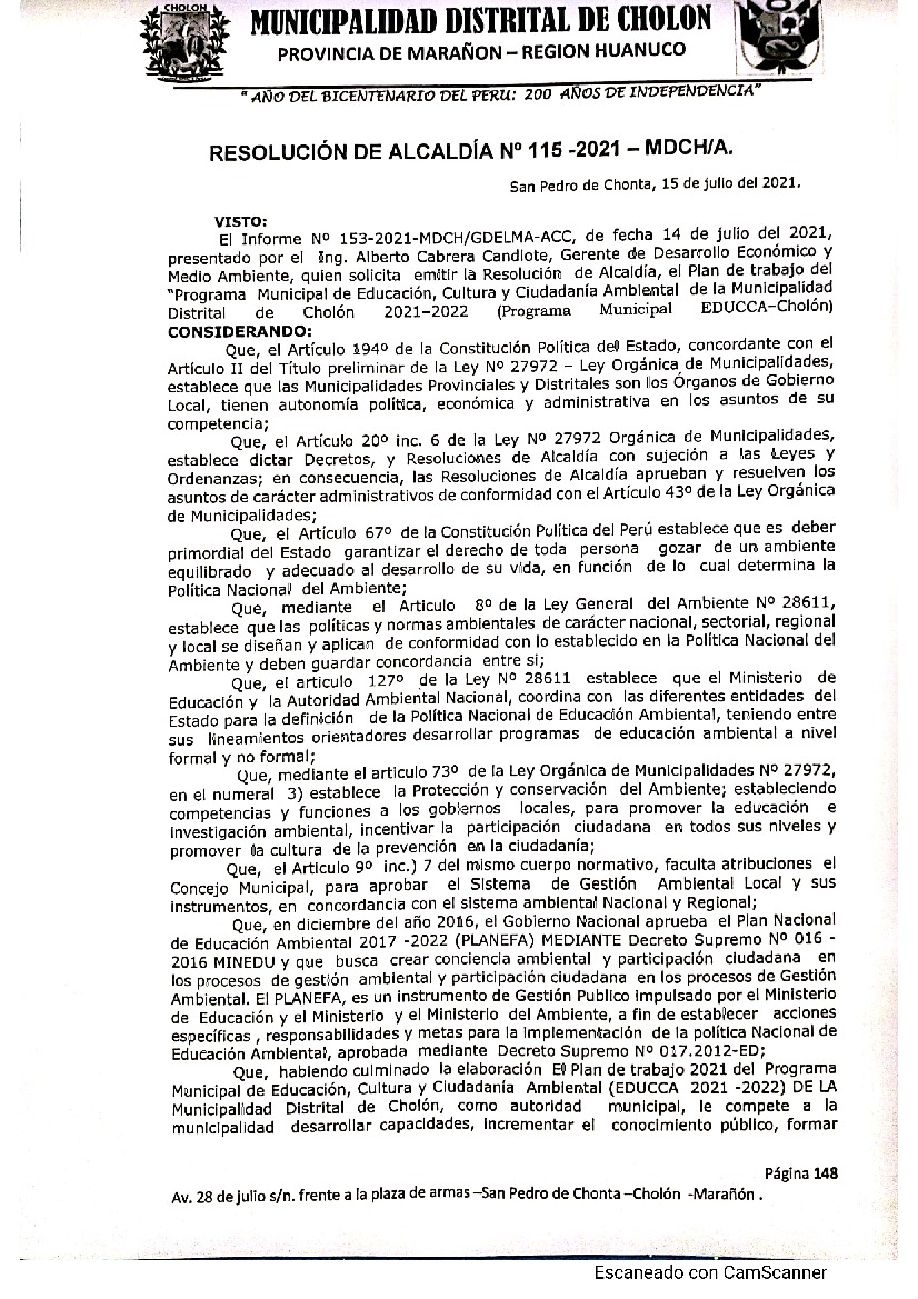 La presente Resolución aprueba el Plan de Trabajo 2021 del Programa Municipal de Educación, Cultura y Ciudadanía Ambiental de la Municipalidad Distrital de Cholón, con la finalidad de definir las actividades de educación, cultura y ciudadanía ambiental que se desarrollarán en la localidad durante el presente año.