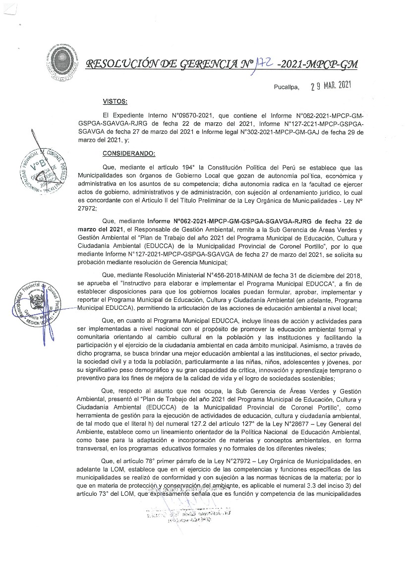 La presente Resolución aprueba el Plan de Trabajo 2021 del Programa Municipal de Educación, Cultura y Ciudadanía Ambiental de la Municipalidad Provincia de Coronel Portillo, con la finalidad de definir las actividades de educación, cultura y ciudadanía ambiental que se desarrollarán en la localidad durante el presente año.