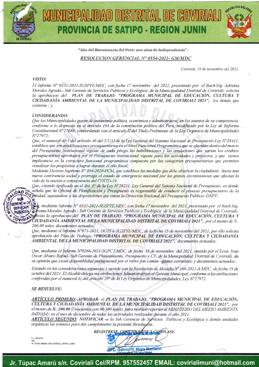 La presente Resolución aprueba el Plan de Trabajo 2021 del Programa Municipal de Educación, Cultura y Ciudadanía Ambiental de la Municipalidad Distrital de Coviriali, con la finalidad de definir las actividades de educación, cultura y ciudadanía ambiental que se desarrollarán en la localidad durante el presente año.
