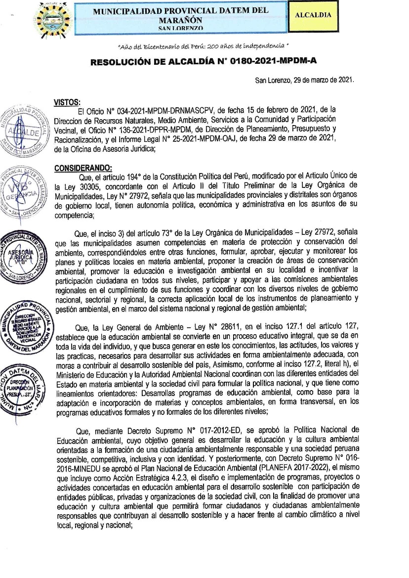 La presente Resolución aprueba el Plan de Trabajo 2021 del Programa Municipal de Educación, Cultura y Ciudadanía Ambiental de la Municipalidad Provincia de Datem del Marañón, con la finalidad de definir las actividades de educación, cultura y ciudadanía ambiental que se desarrollarán en la localidad durante el presente año.