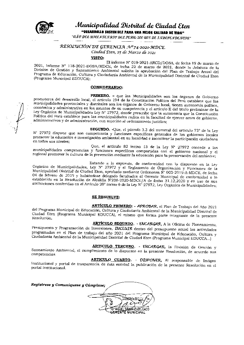 La presente Resolución aprueba el Plan de Trabajo 2021 del Programa Municipal de Educación, Cultura y Ciudadanía Ambiental de la Municipalidad Distrital de Eten, con la finalidad de definir las actividades de educación, cultura y ciudadanía ambiental que se desarrollarán en la localidad durante el presente año.