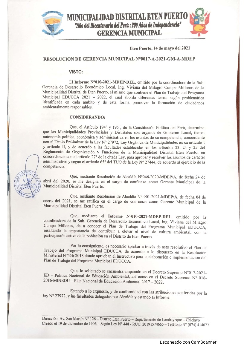 La presente Resolución aprueba el Plan de Trabajo 2021 del Programa Municipal de Educación, Cultura y Ciudadanía Ambiental de la Municipalidad Distrital de Eten Puerto, con la finalidad de definir las actividades de educación, cultura y ciudadanía ambiental que se desarrollarán en la localidad durante el presente año.
