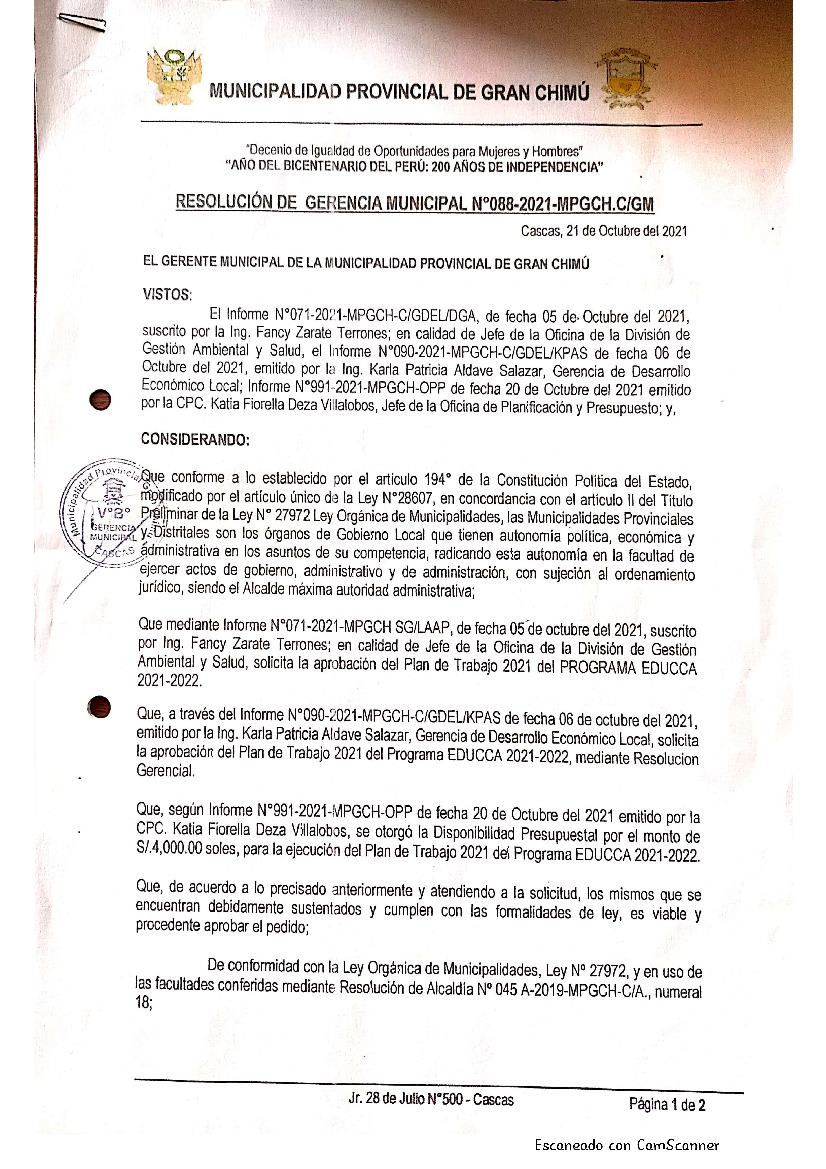 La presente Resolución aprueba el Plan de Trabajo 2021 del Programa Municipal de Educación, Cultura y Ciudadanía Ambiental de la Municipalidad Provincial de Gran Chimú, con la finalidad de definir las actividades de educación, cultura y ciudadanía ambiental que se desarrollarán en la localidad durante el presente año.