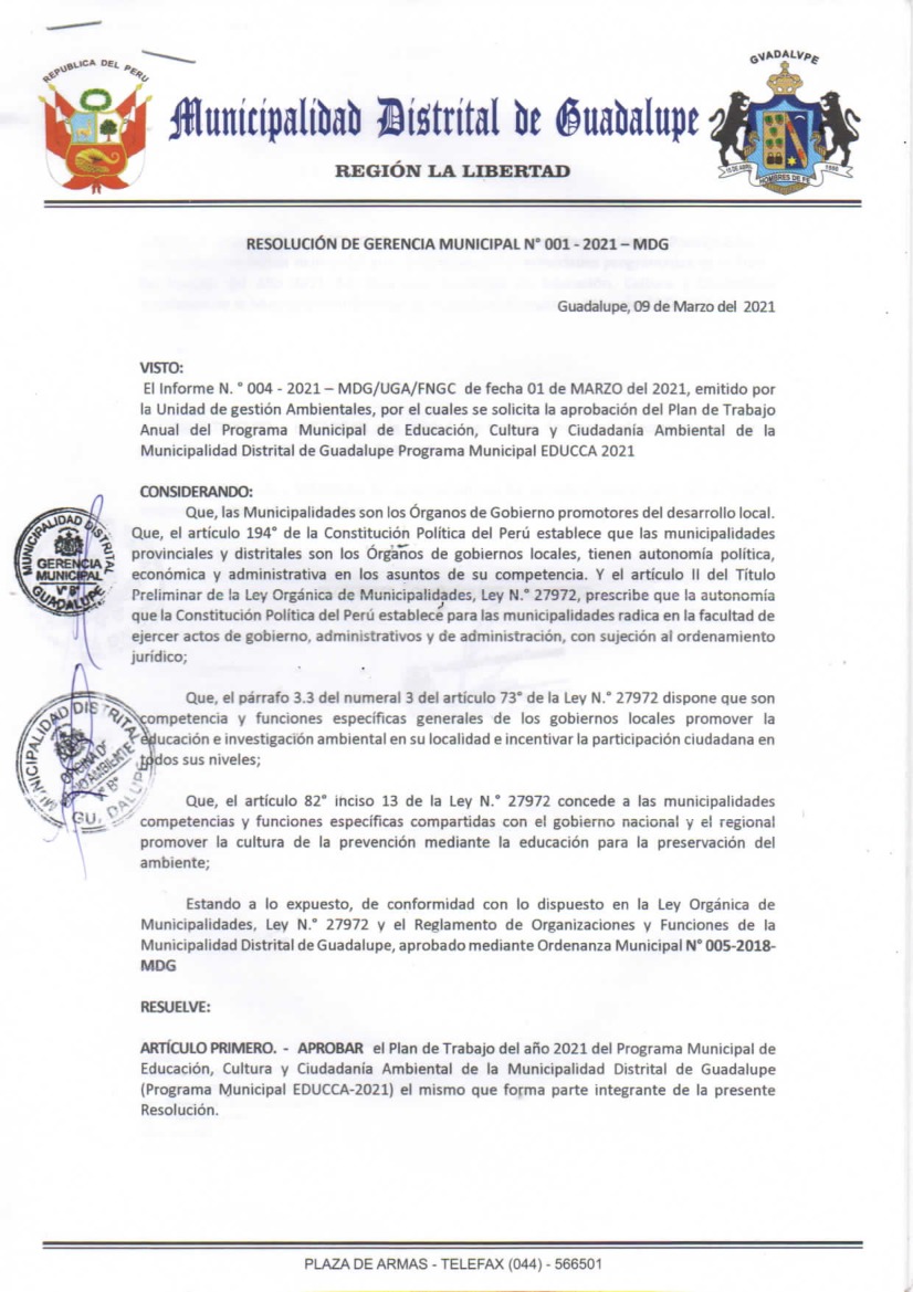 La presente Resolución aprueba el Plan de Trabajo 2021 del Programa Municipal de Educación, Cultura y Ciudadanía Ambiental de la Municipalidad Distrital de Guadalupe, con la finalidad de definir las actividades de educación, cultura y ciudadanía ambiental que se desarrollarán en la localidad durante el presente año.