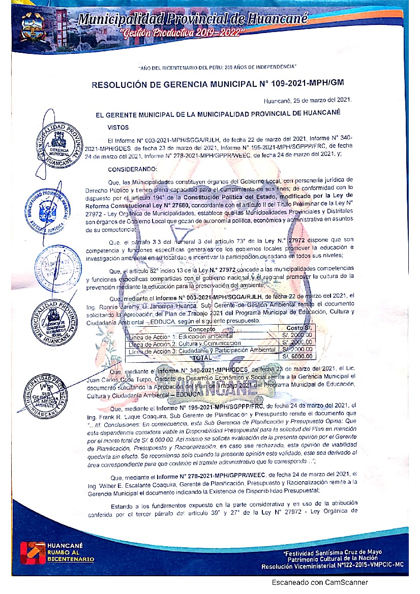 La presente Resolución aprueba el Plan de Trabajo 2021 del Programa Municipal de Educación, Cultura y Ciudadanía Ambiental de la Municipalidad Provincial de Huancané, con la finalidad de definir las actividades de educación, cultura y ciudadanía ambiental que se desarrollarán en la localidad durante el presente año.
