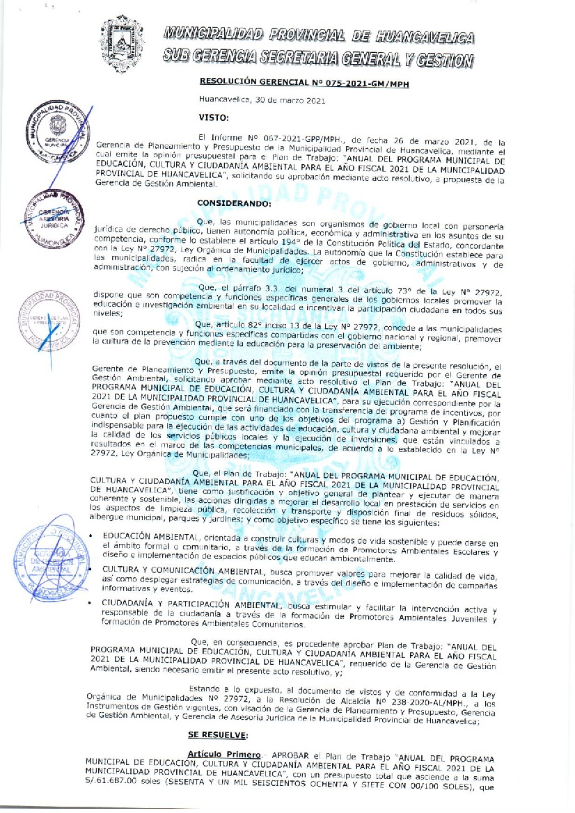 La presente Resolución aprueba el Plan de Trabajo 2021 del Programa Municipal de Educación, Cultura y Ciudadanía Ambiental de la Municipalidad Provincial de Huancavelica, con la finalidad de definir las actividades de educación, cultura y ciudadanía ambiental que se desarrollarán en la localidad durante el presente año.