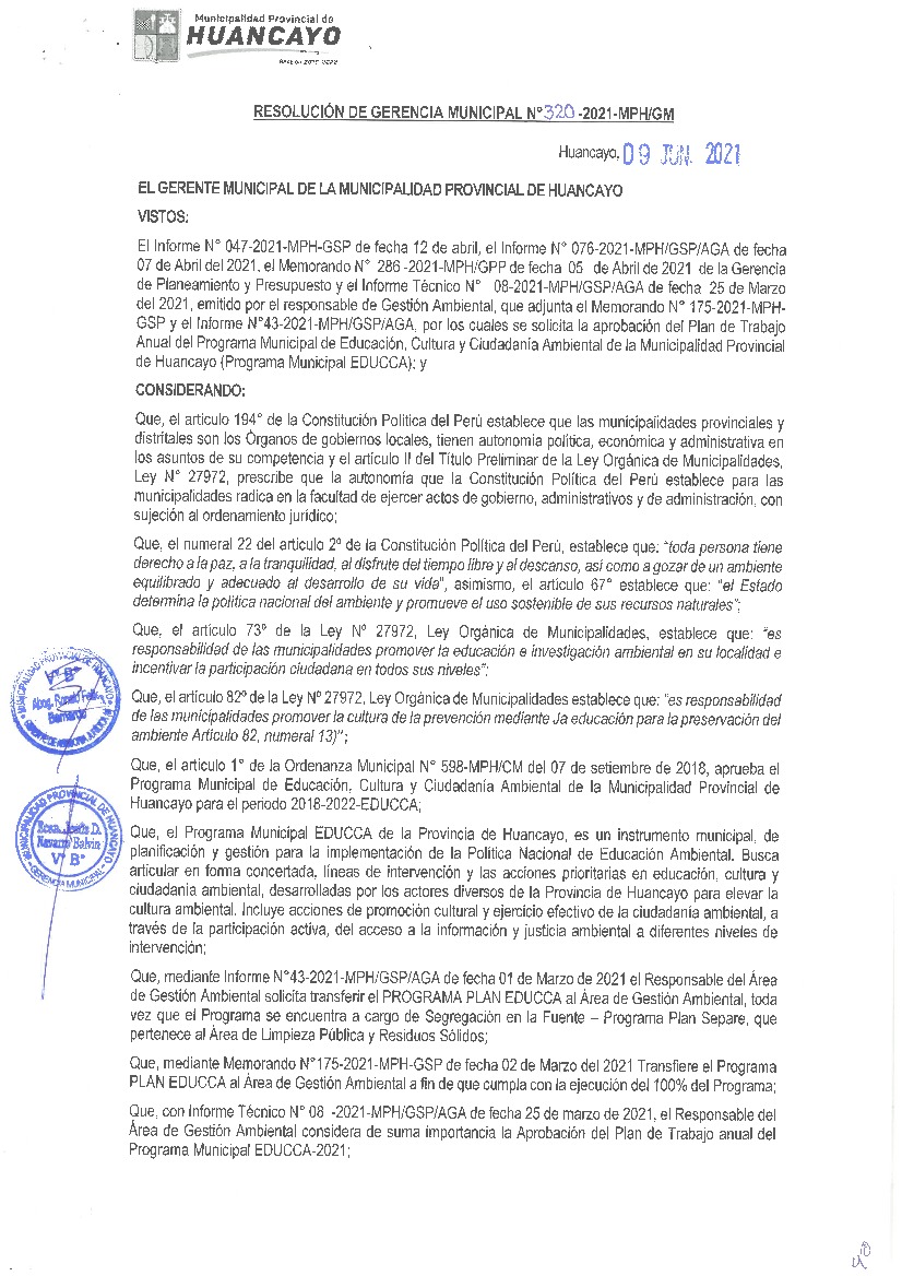 La presente Resolución aprueba el Plan de Trabajo 2021 del Programa Municipal de Educación, Cultura y Ciudadanía Ambiental de la Municipalidad Provincial de Huancayo, con la finalidad de definir las actividades de educación, cultura y ciudadanía ambiental que se desarrollarán en la localidad durante el presente año.