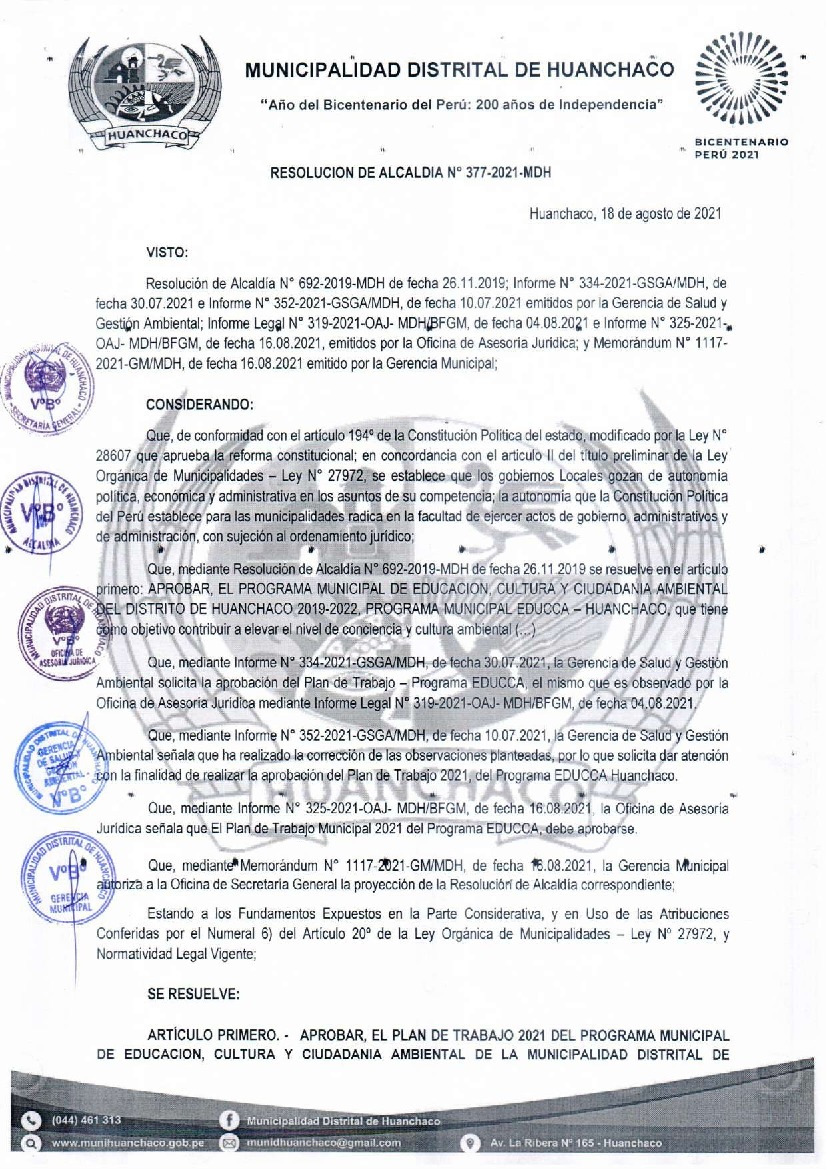 La presente Resolución aprueba el Plan de Trabajo 2021 del Programa Municipal de Educación, Cultura y Ciudadanía Ambiental de la Municipalidad Distrital de Huanchaco, con la finalidad de definir las actividades de educación, cultura y ciudadanía ambiental que se desarrollarán en la localidad durante el presente año.