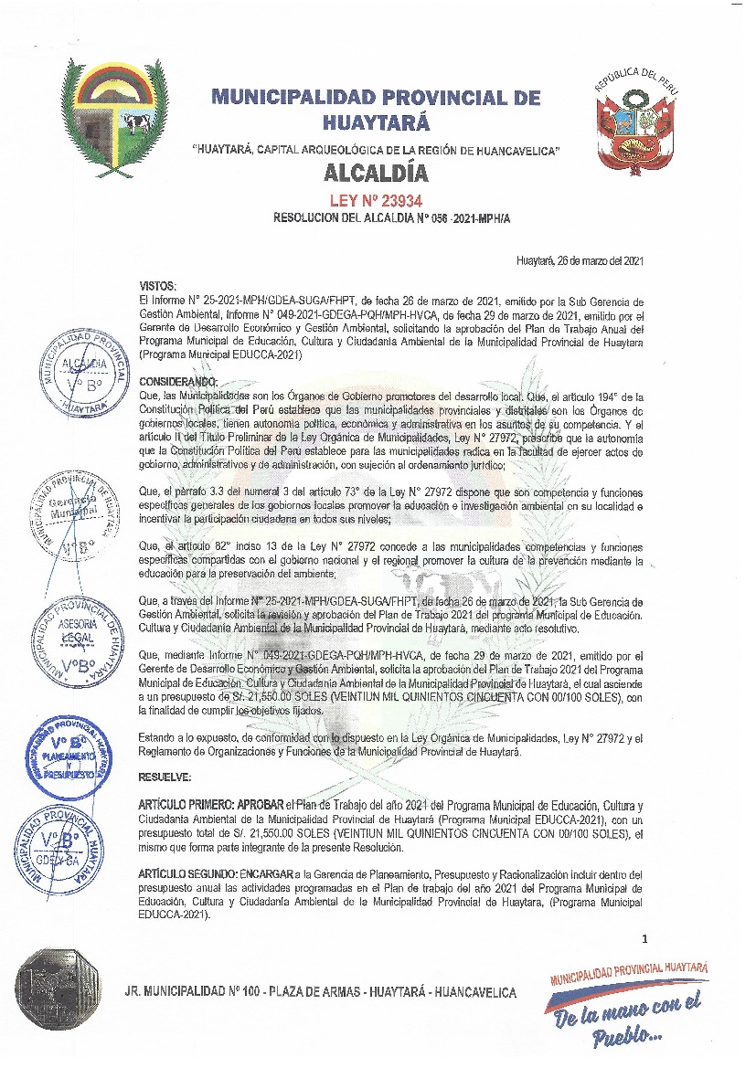 La presente Resolución aprueba el Plan de Trabajo 2021 del Programa Municipal de Educación, Cultura y Ciudadanía Ambiental de la Municipalidad Provincial de Huaytará, con la finalidad de definir las actividades de educación, cultura y ciudadanía ambiental que se desarrollarán en la localidad durante el presente año.