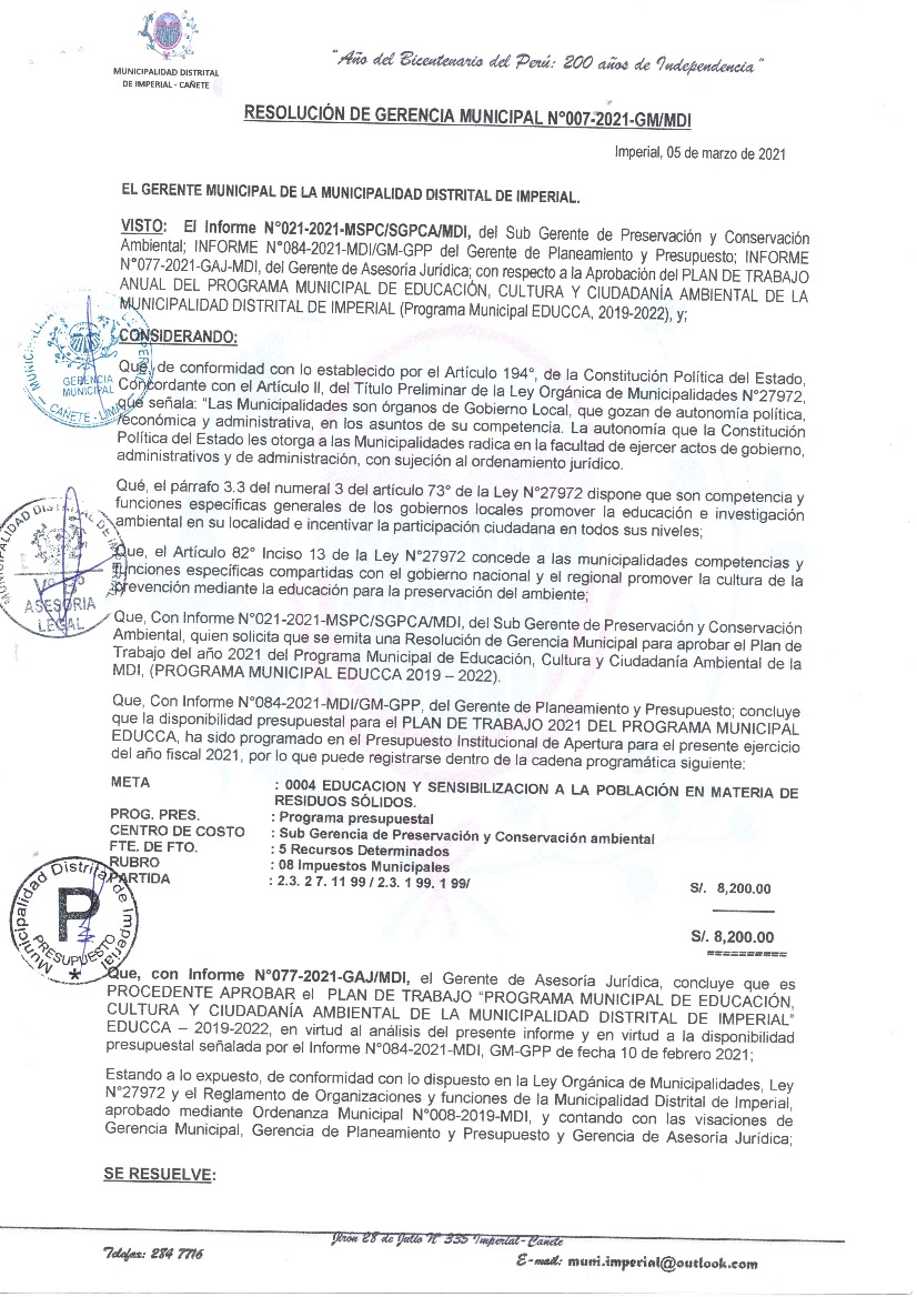 La presente Resolución aprueba el Plan de Trabajo 2021 del Programa Municipal de Educación, Cultura y Ciudadanía Ambiental de la Municipalidad Distrital de Imperial, con la finalidad de definir las actividades de educación, cultura y ciudadanía ambiental que se desarrollarán en la localidad durante el presente año.