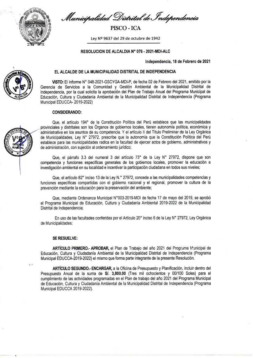La presente Resolución aprueba el Plan de Trabajo 2021 del Programa Municipal de Educación, Cultura y Ciudadanía Ambiental de la Municipalidad Distrital de Independencia, con la finalidad de definir las actividades de educación, cultura y ciudadanía ambiental que se desarrollarán en la localidad durante el presente año.