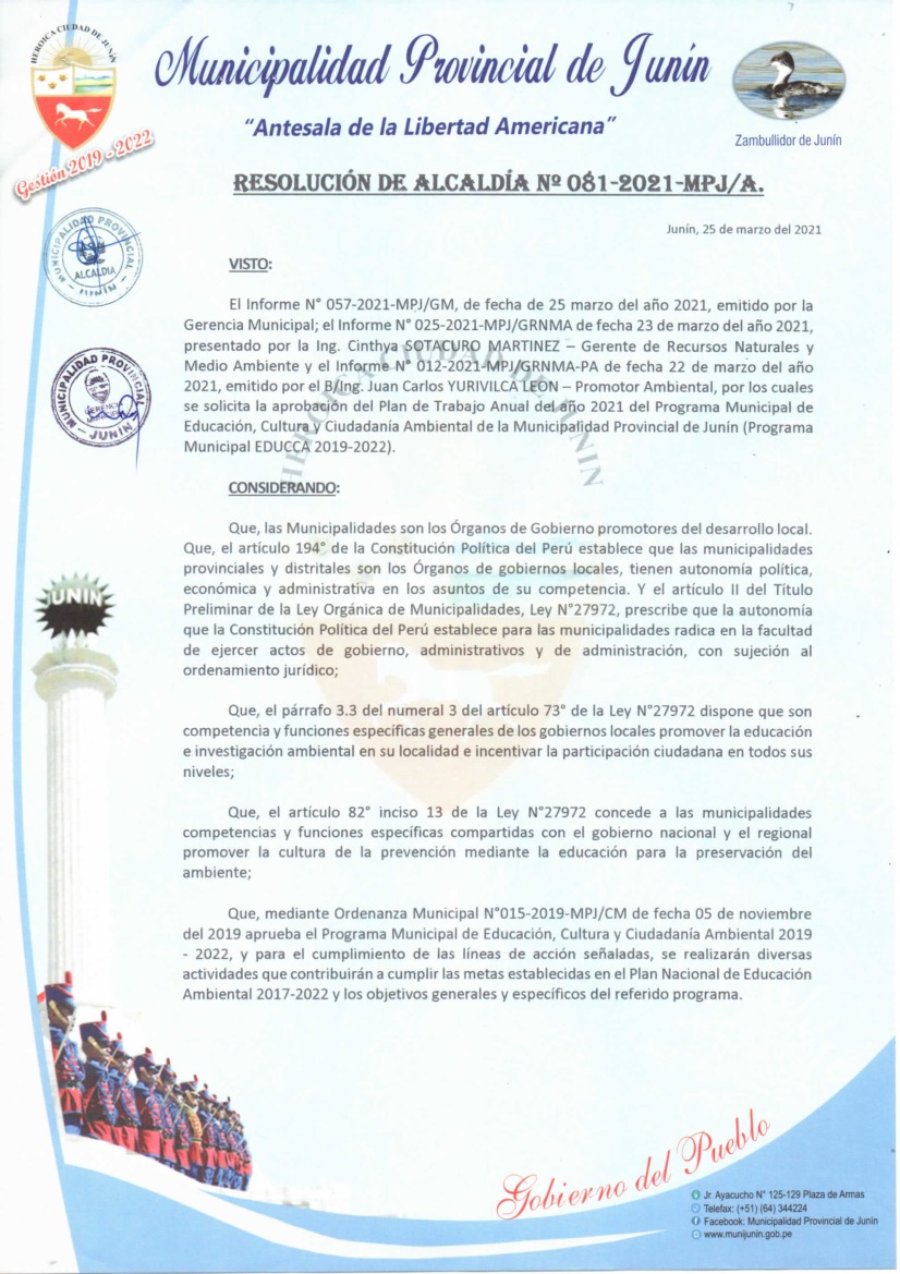La presente Resolución aprueba el Plan de Trabajo 2021 del Programa Municipal de Educación, Cultura y Ciudadanía Ambiental de la Municipalidad Provincial de Junín, con la finalidad de definir las actividades de educación, cultura y ciudadanía ambiental que se desarrollarán en la localidad durante el presente año.