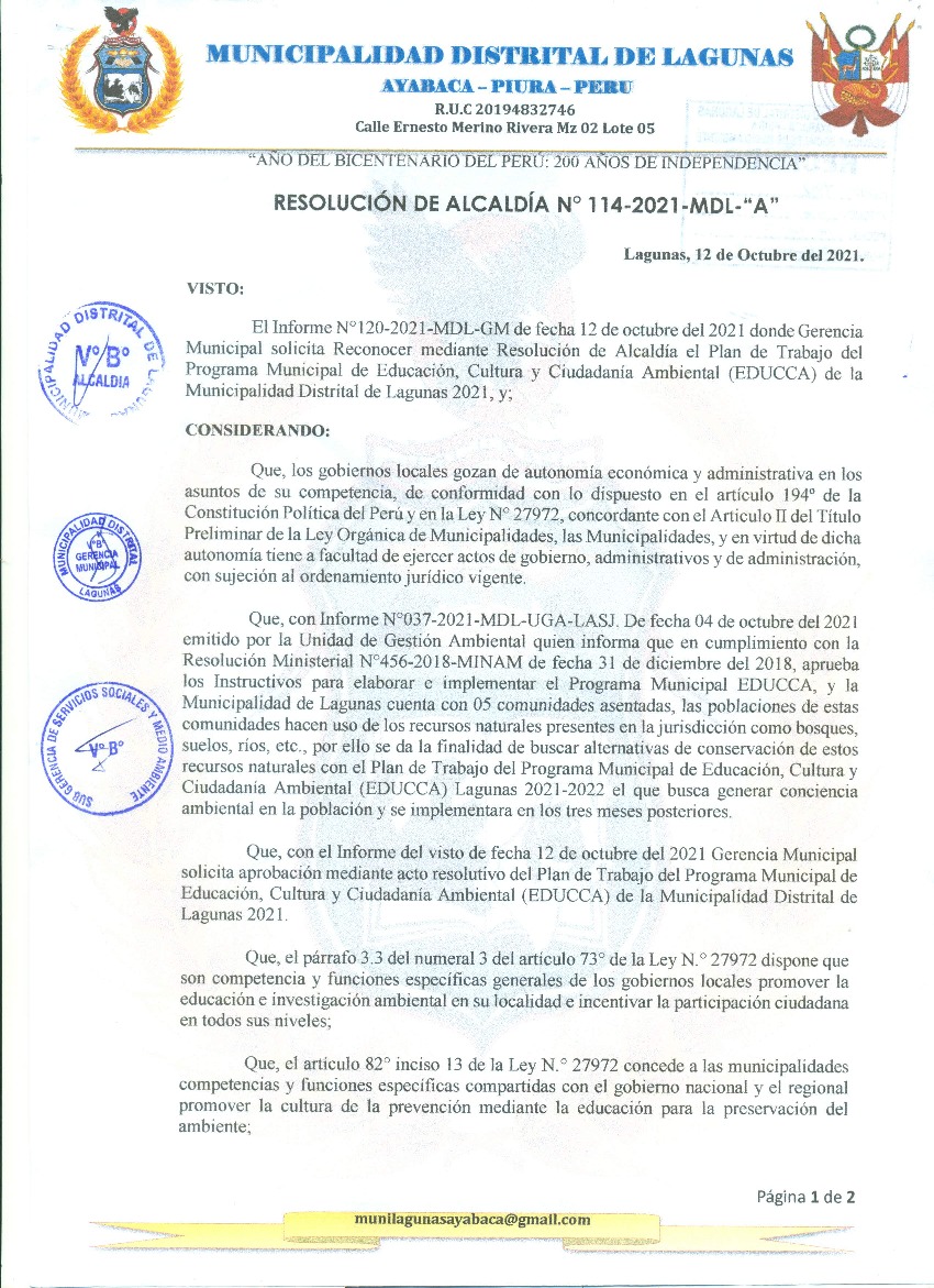 La presente Resolución aprueba el Plan de Trabajo 2021 del Programa Municipal de Educación, Cultura y Ciudadanía Ambiental de la Municipalidad Distrital de Lagunas, con la finalidad de definir las actividades de educación, cultura y ciudadanía ambiental que se desarrollarán en la localidad durante el presente año.