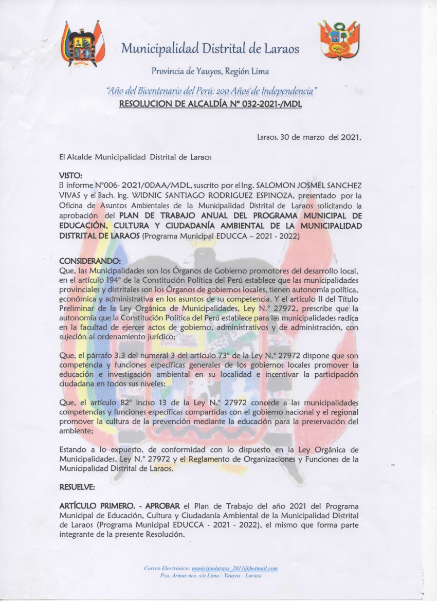 La presente Resolución aprueba el Plan de Trabajo 2021 del Programa Municipal de Educación, Cultura y Ciudadanía Ambiental de la Municipalidad Distrital de Laraos, con la finalidad de definir las actividades de educación, cultura y ciudadanía ambiental que se desarrollarán en la localidad durante el presente año.