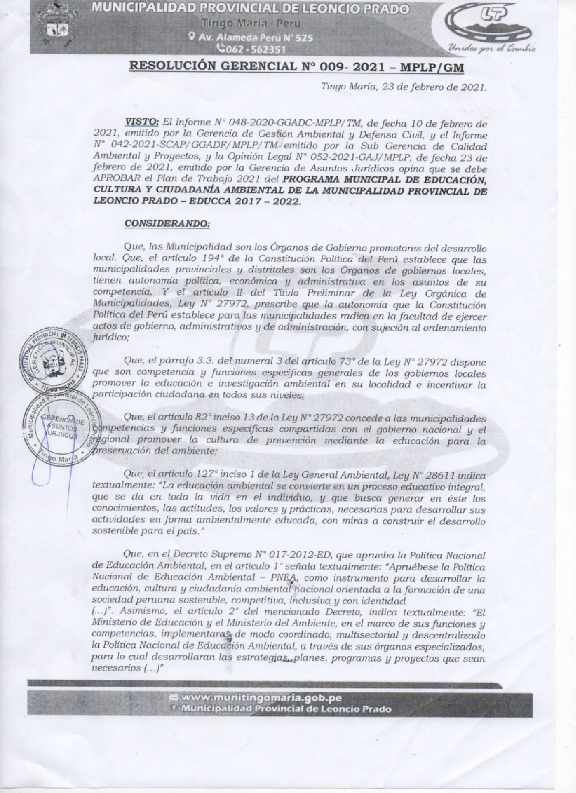 La presente Resolución aprueba el Plan de Trabajo 2021 del Programa Municipal de Educación, Cultura y Ciudadanía Ambiental de la Municipalidad Provincia de Leoncio Prado, con la finalidad de definir las actividades de educación, cultura y ciudadanía ambiental que se desarrollarán en la localidad durante el presente año.