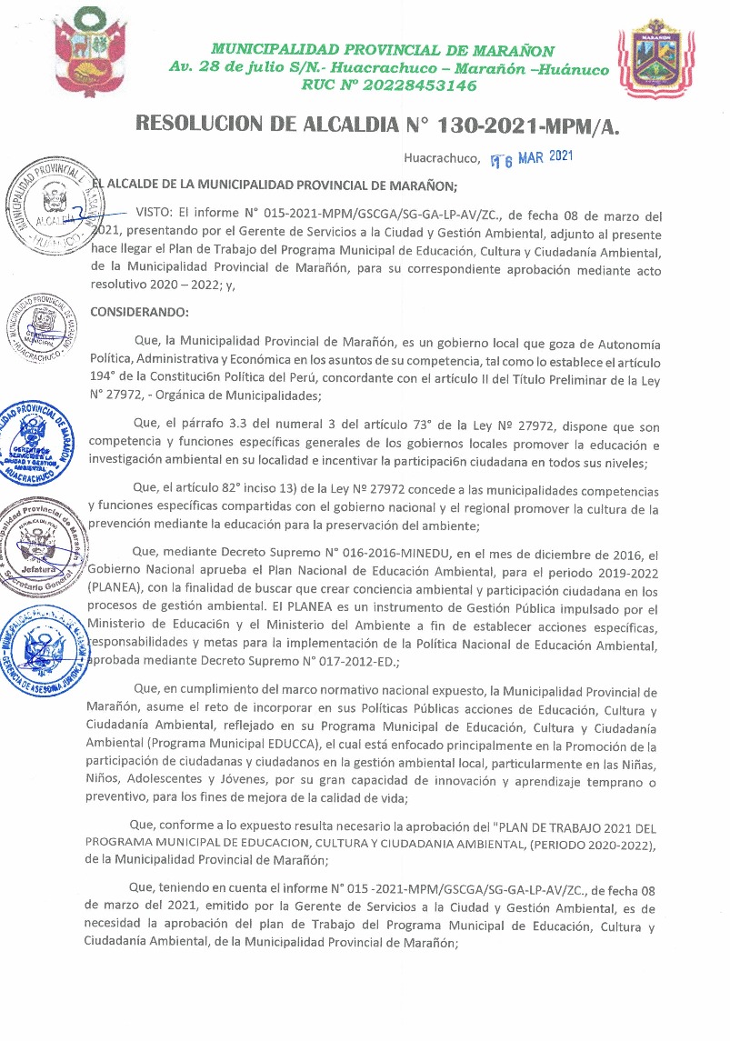 La presente Resolución aprueba el Plan de Trabajo 2021 del Programa Municipal de Educación, Cultura y Ciudadanía Ambiental de la Municipalidad Provincia de Marañón, con la finalidad de definir las actividades de educación, cultura y ciudadanía ambiental que se desarrollarán en la localidad durante el presente año.
