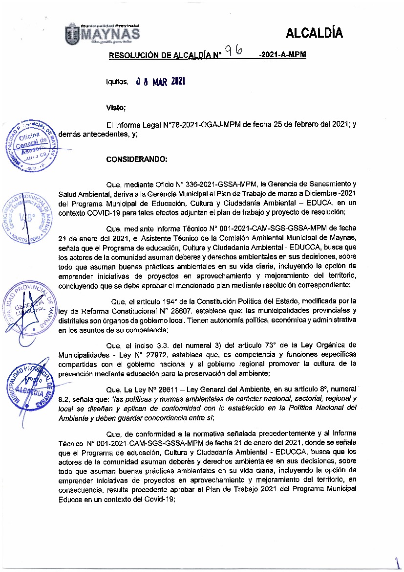 La presente Resolución aprueba el Plan de Trabajo 2021 del Programa Municipal de Educación, Cultura y Ciudadanía Ambiental de la Municipalidad Provincia de Maynas, con la finalidad de definir las actividades de educación, cultura y ciudadanía ambiental que se desarrollarán en la localidad durante el presente año.