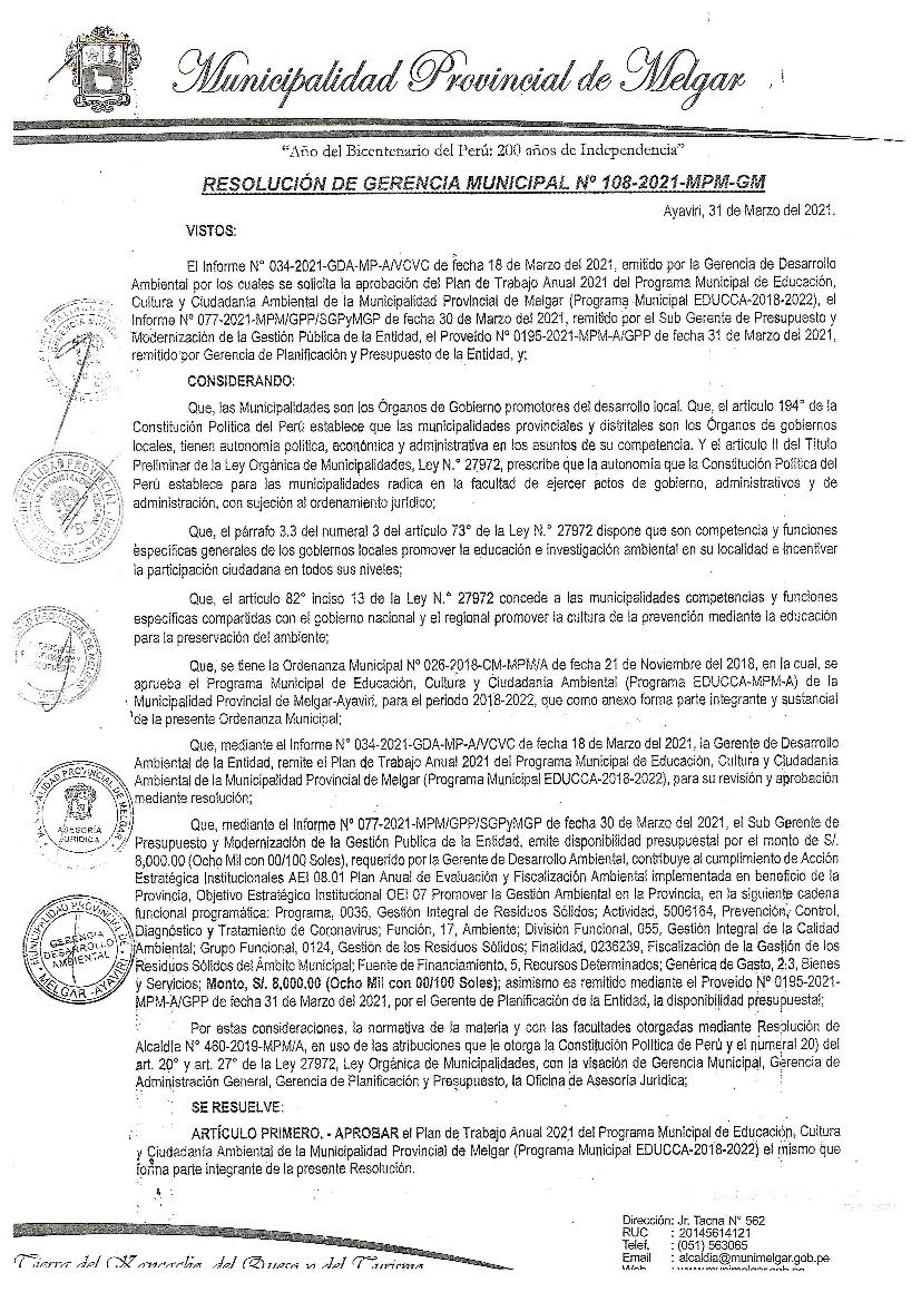 La presente Resolución aprueba el Plan de Trabajo 2021 del Programa Municipal de Educación, Cultura y Ciudadanía Ambiental de la Municipalidad Provincial de Melgar, con la finalidad de definir las actividades de educación, cultura y ciudadanía ambiental que se desarrollarán en la localidad durante el presente año.