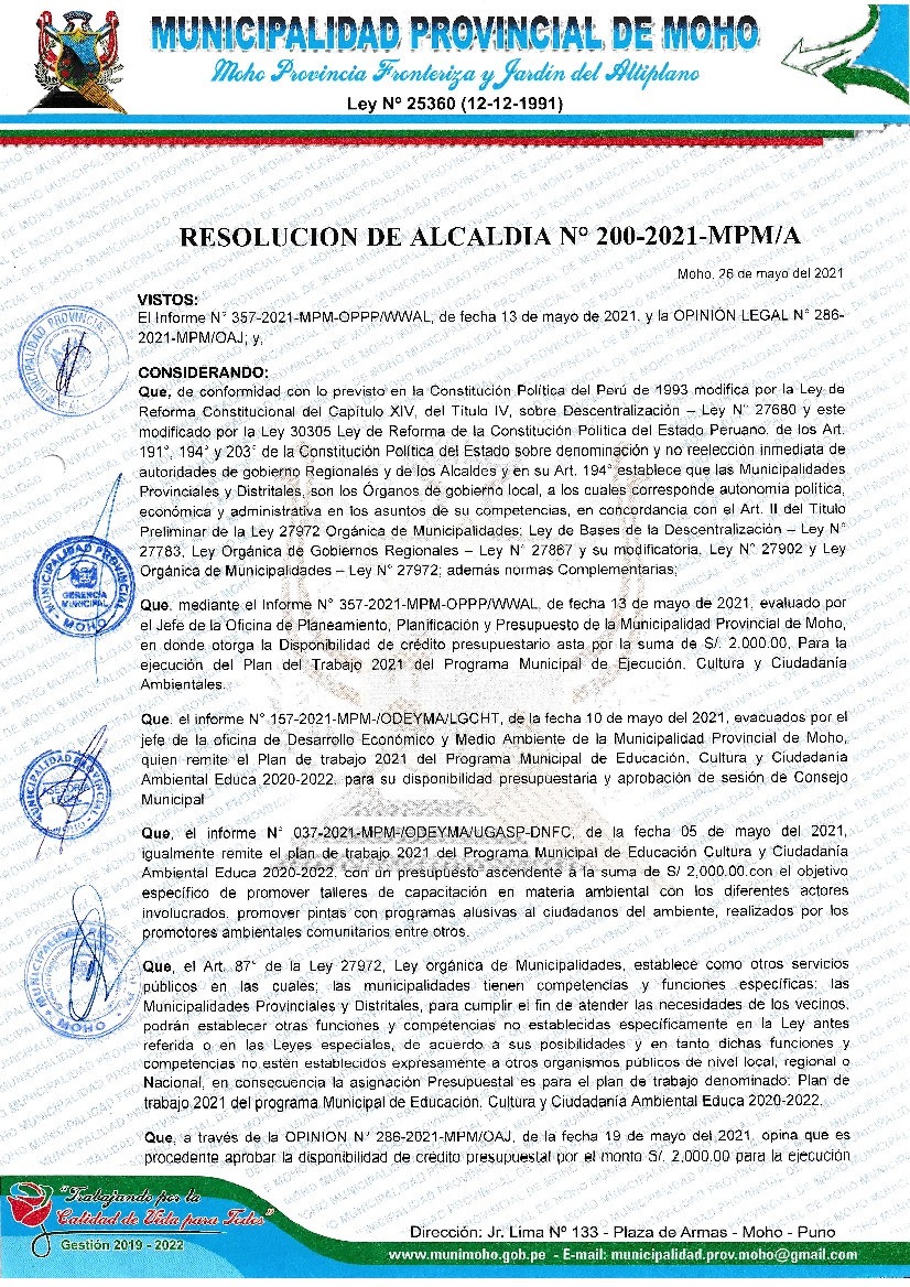 La presente Resolución aprueba el Plan de Trabajo 2021 del Programa Municipal de Educación, Cultura y Ciudadanía Ambiental de la Municipalidad Provincial de Moho, con la finalidad de definir las actividades de educación, cultura y ciudadanía ambiental que se desarrollarán en la localidad durante el presente año.