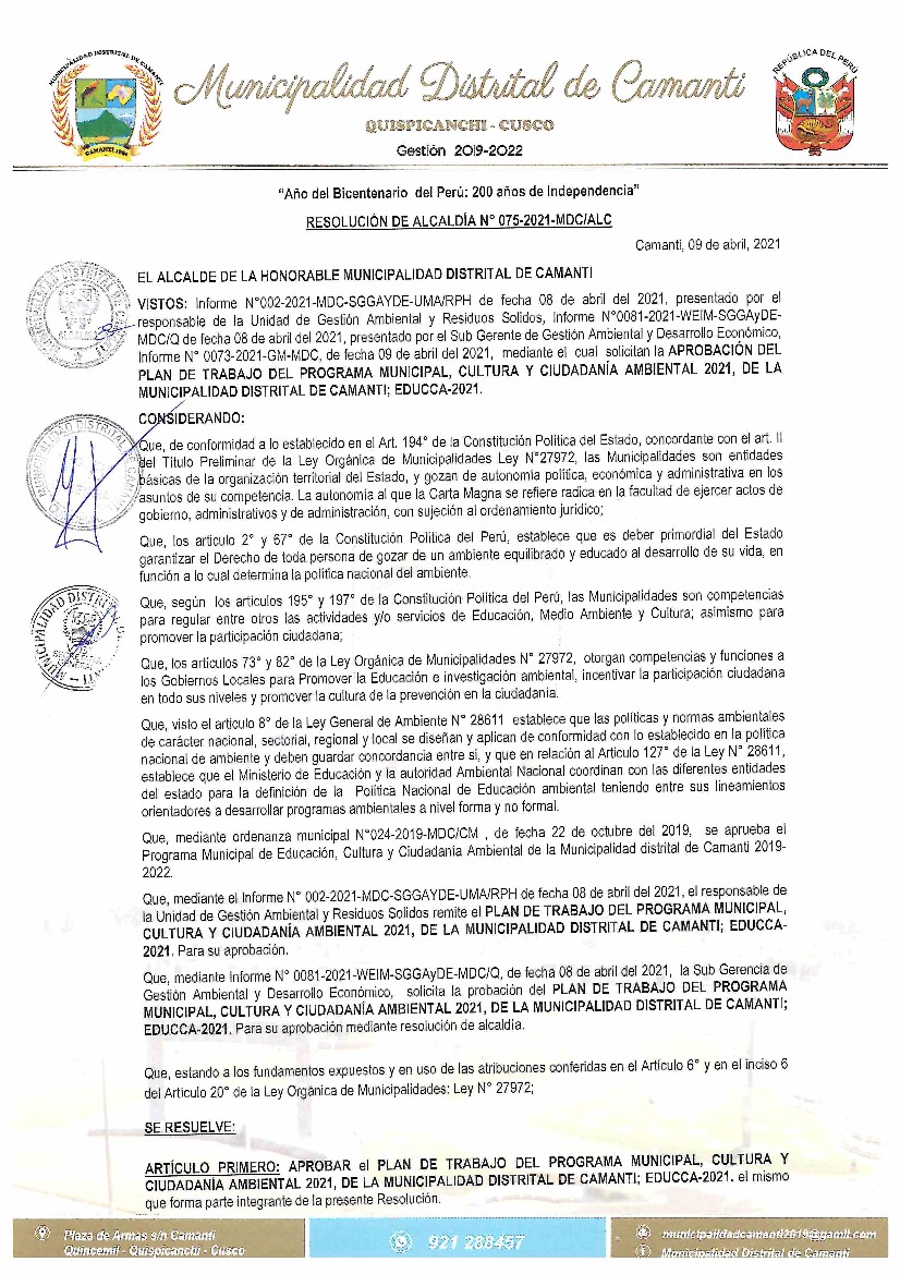 La presente Resolución aprueba el Plan de Trabajo 2021 del Programa Municipal de Educación, Cultura y Ciudadanía Ambiental de la Municipalidad Distrital de Camanti, con la finalidad de definir las actividades de educación, cultura y ciudadanía ambiental que se desarrollarán en la localidad durante el presente año.