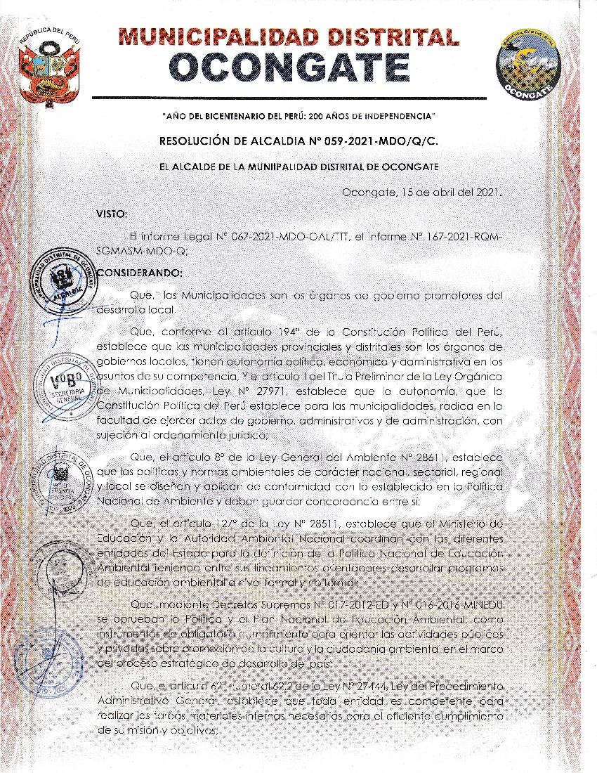 La presente Resolución aprueba el Plan de Trabajo 2021 del Programa Municipal de Educación, Cultura y Ciudadanía Ambiental de la Municipalidad Distrital de Ocongate, con la finalidad de definir las actividades de educación, cultura y ciudadanía ambiental, que se desarrollará en la localidad durante el presente año.
