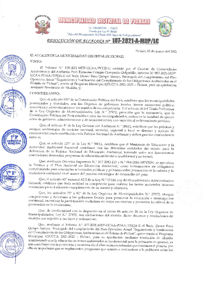 La Presente Resolución aprueba el Plan de Trabajo 2021 del Programa Municipal de Educación, Cultura y Ciudadanía ambiental de la Municipalidad Distrital de Pichari-La Convención, con la finalidad de definir las actividades de educación, cultura y Ciudadanía Ambiental, que se desarrollará en la localidad durante el presente año.