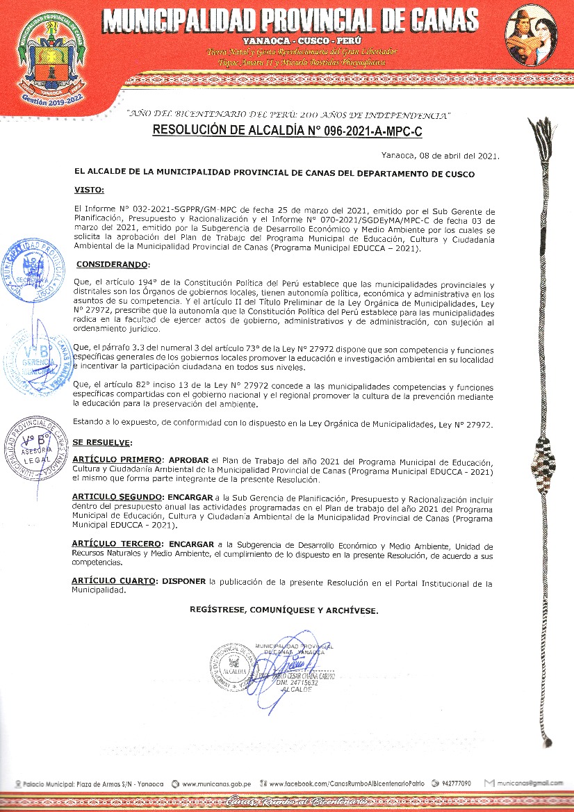 La presente Resolución aprueba el Plan de Trabajo 2021 del Programa Municipal de Educación Cultura y Ciudadanía Ambiental de la Municipalidad Provincial de Canas, con la finalidad de definir las actividades de educación cultura y ciudadanía ambiental, que se desarrollarán en la localidad durante el presente año .
