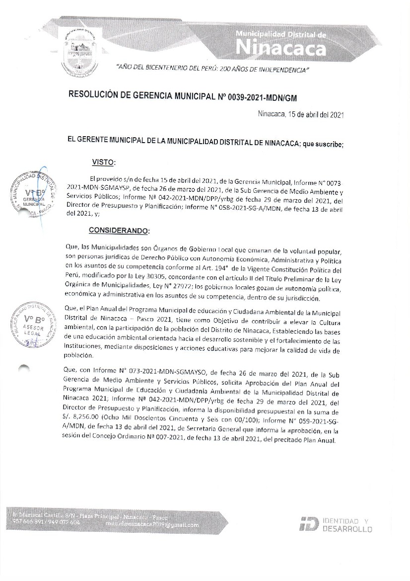 La presente Resolución aprueba el Plan de Trabajo 2021 del Programa Municipal de Educación, Cultura y Ciudadanía Ambiental de la Municipalidad Distrital de Ninacaca, con la finalidad de definir las actividades de educación, cultura y ciudadanía ambiental que se desarrollarán en la localidad durante el presente año.