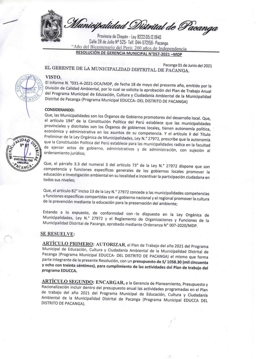 La presente Resolución aprueba el Plan de Trabajo 2021 del Programa Municipal de Educación, Cultura y Ciudadanía Ambiental de la Municipalidad Distrital de Pacanga, con la finalidad de definir las actividades de educación, cultura y ciudadanía ambiental que se desarrollarán en la localidad durante el presente año.