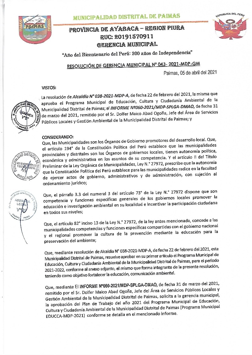 La presente Resolución aprueba el Plan de Trabajo 2021 del Programa Municipal de Educación, Cultura y Ciudadanía Ambiental de la Municipalidad Distrital de Paimas, con la finalidad de definir las actividades de educación, cultura y ciudadanía ambiental que se desarrollarán en la localidad durante el presente año.