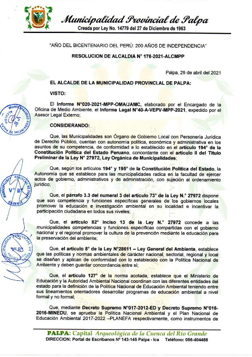 La presente Resolución aprueba el Plan de Trabajo 2021 del Programa Municipal de Educación, Cultura y Ciudadanía Ambiental de la Municipalidad Provincial de Palpa, con la finalidad de definir las actividades de educación, cultura y ciudadanía ambiental que se desarrollarán en la localidad durante el presente año.
