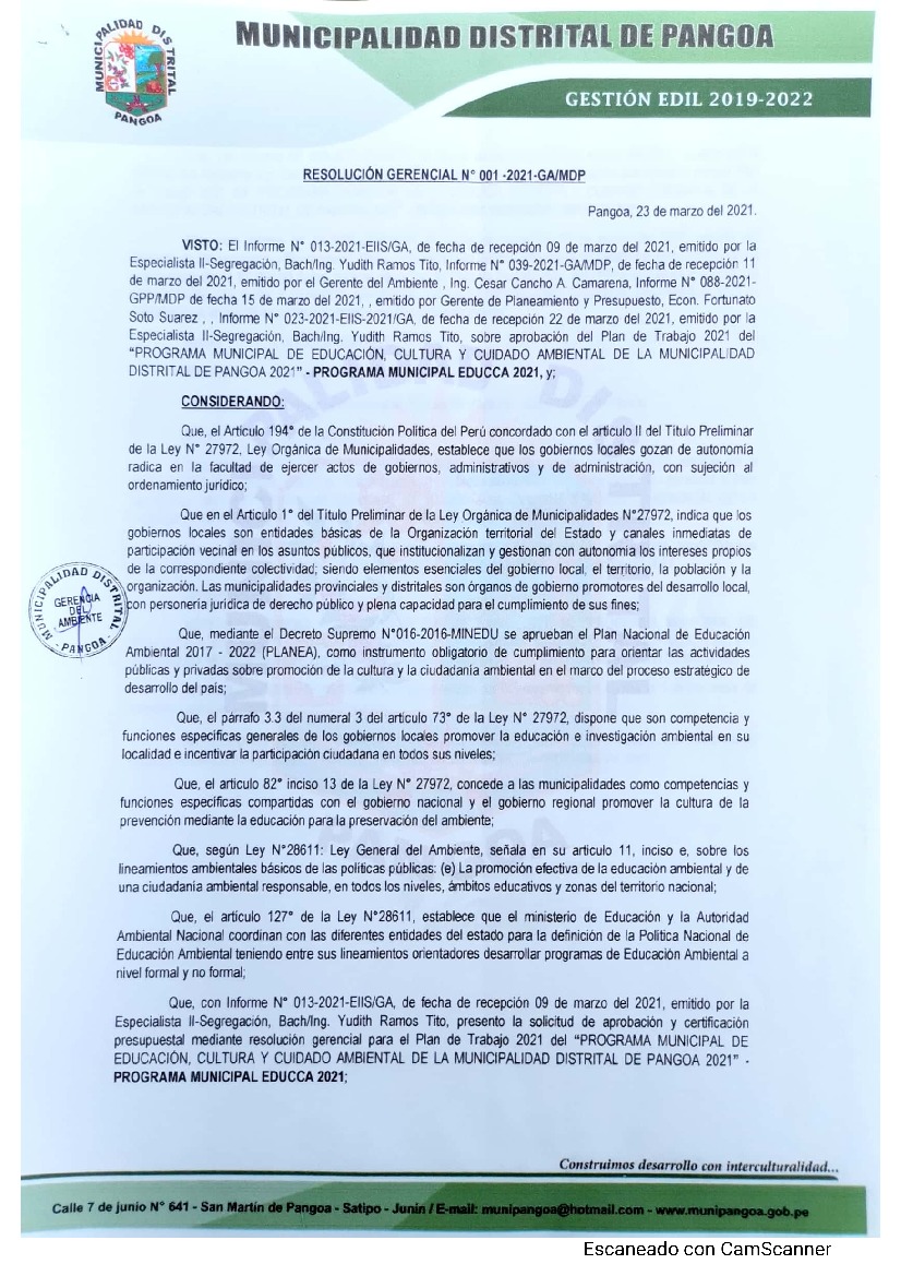 La presente Resolución aprueba el Plan de Trabajo 2021 del Programa Municipal de Educación, Cultura y Ciudadanía Ambiental de la Municipalidad Distrital de Pangoa, con la finalidad de definir las actividades de educación, cultura y ciudadanía ambiental que se desarrollarán en la localidad durante el presente año.