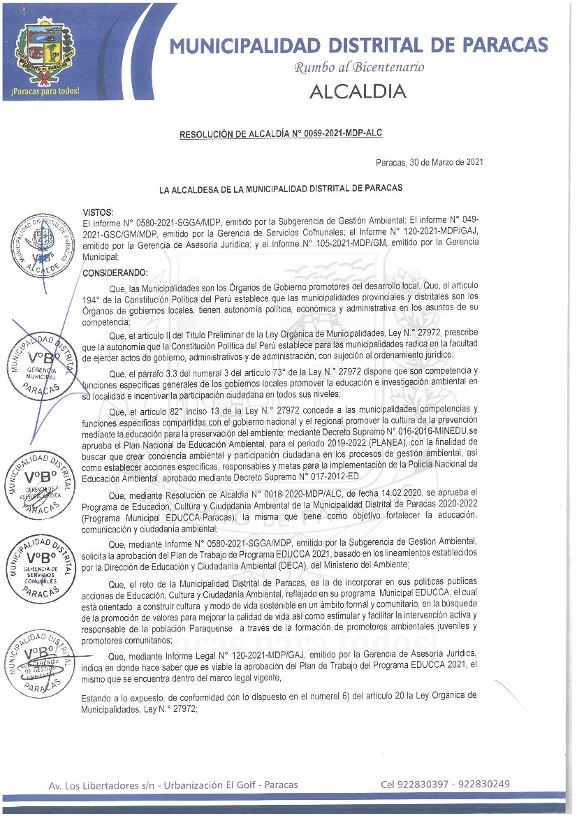 La presente Resolución aprueba el Plan de Trabajo 2021 del Programa Municipal de Educación, Cultura y Ciudadanía Ambiental de la Municipalidad Distrital de Paracas, con la finalidad de definir las actividades de educación, cultura y ciudadanía ambiental que se desarrollarán en la localidad durante el presente año.