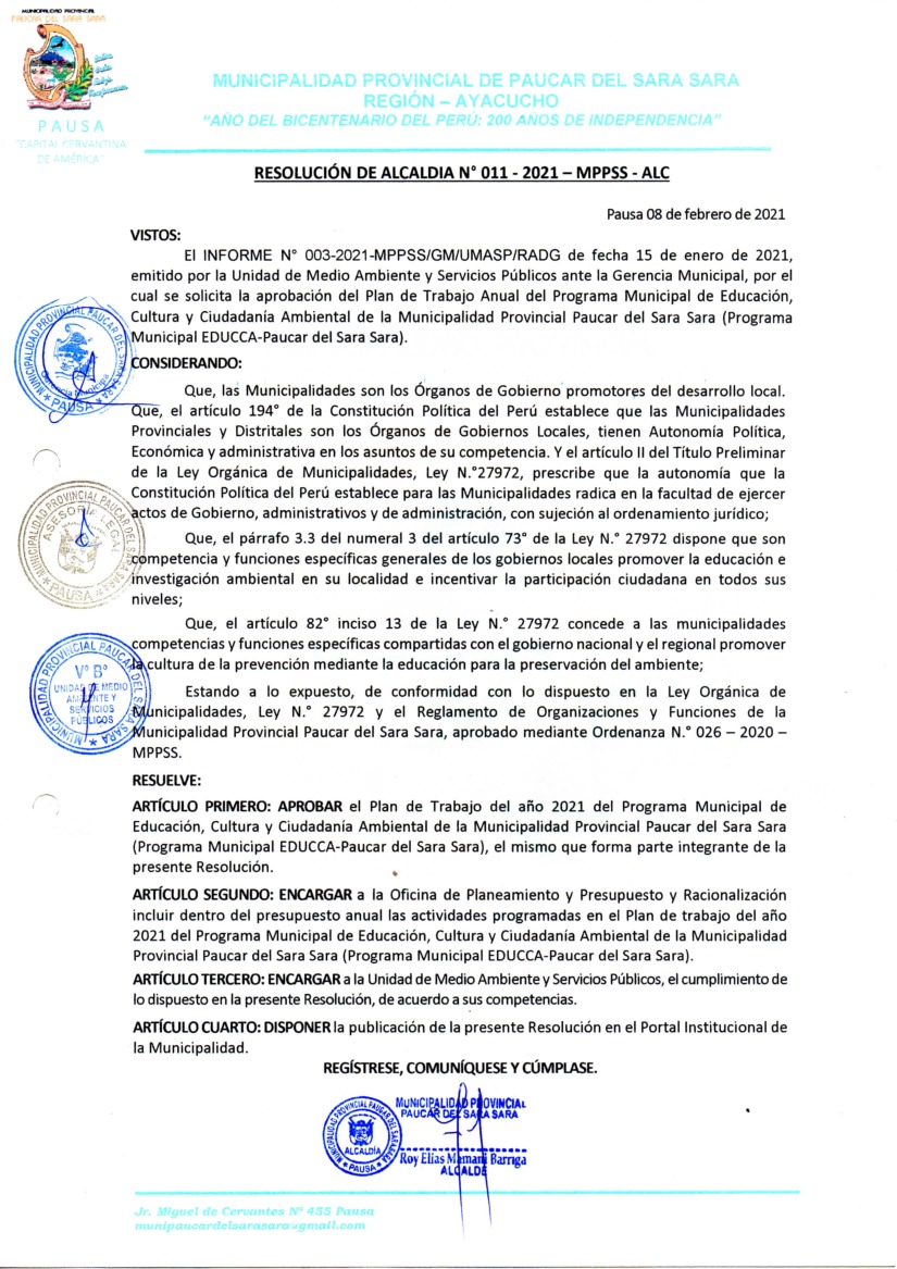 La presente Resolución aprueba el Plan de Trabajo 2021 del Programa Municipal de Educación, Cultura y Ciudadanía Ambiental de la Municipalidad Provincia de Paucar del Sara Sara, con la finalidad de definir las actividades de educación, cultura y ciudadanía ambiental que se desarrollarán en la localidad durante el presente año.